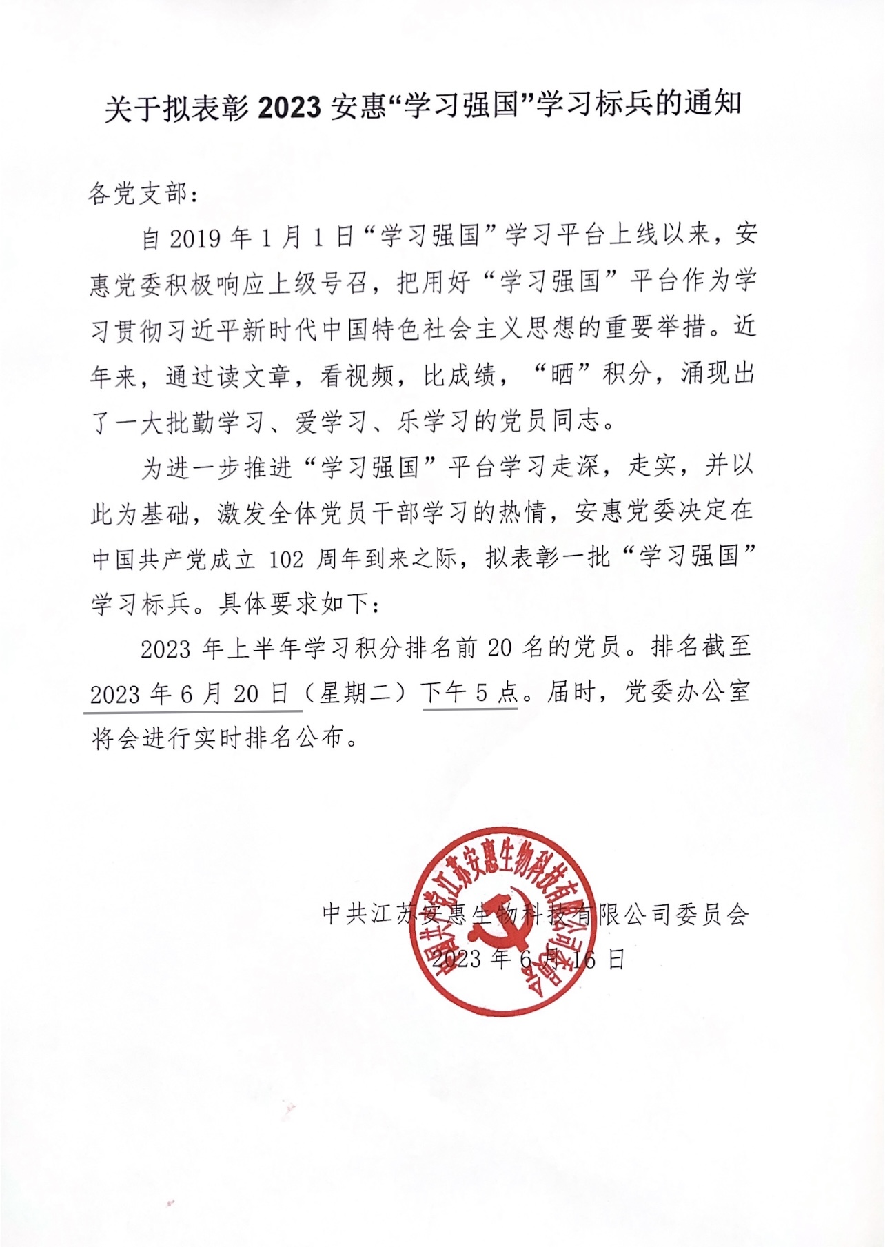 關于擬表彰2023安惠“學習強國”學習標兵的通知