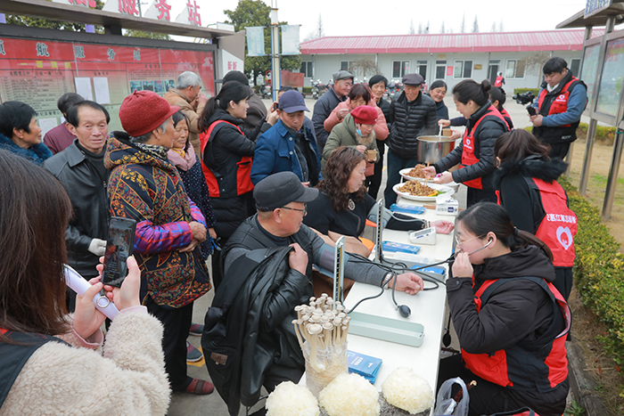 在闞家庵村活動中心,黨總支書記陳忠熱情地接待了安惠江海志愿者一行,并簡要介紹村情。縱有春寒料峭,也抵擋不住大家的熱情,學雷鋒活動吸引了眾多村民前來參加。安惠江海志愿者熱心地為村民們測量血壓,提供健康咨詢。安惠會議中心大廚精心準備了美味的菌菇菜肴:黑椒汁杏鮑菇、糖醋木耳、蛋黃蟹味菇、南瓜茸銀耳,引得村民們連連豎起大拇指:“好吃好吃真好吃!”這些菌菇要怎么烹飪?里面加了什么材料?吃了對人體有什么好處?安惠江海志愿者詳細地為村民們一一解答,并為他們普及“一葷一素一菇”的健康飲食理念。